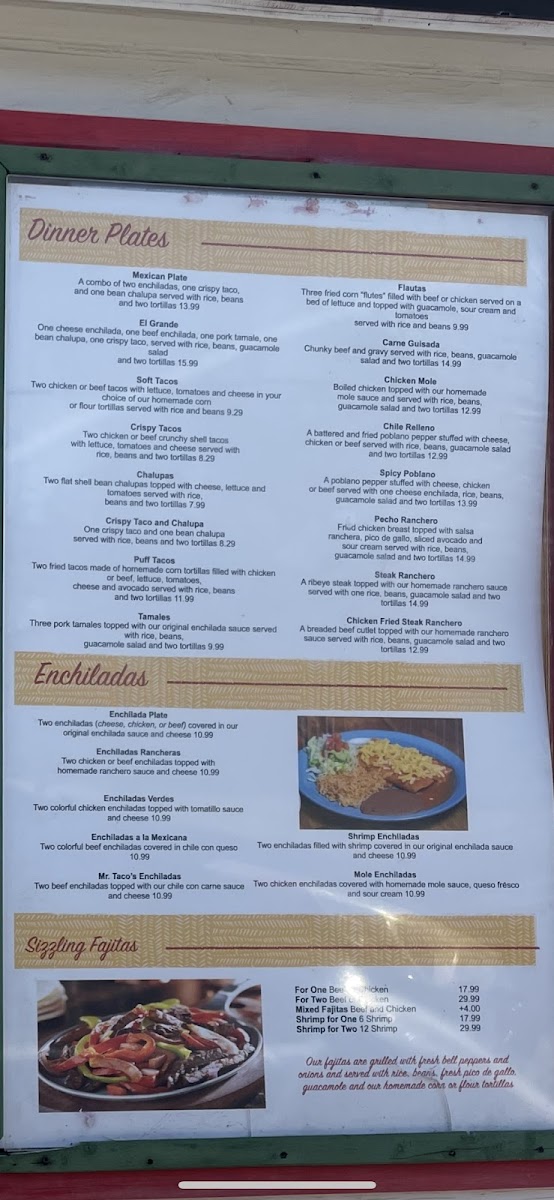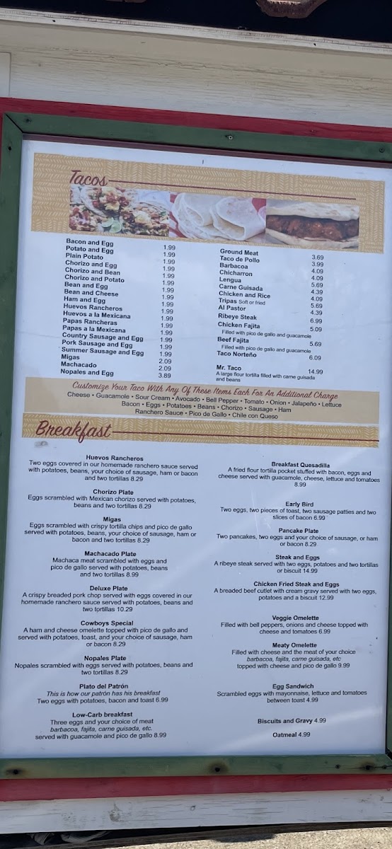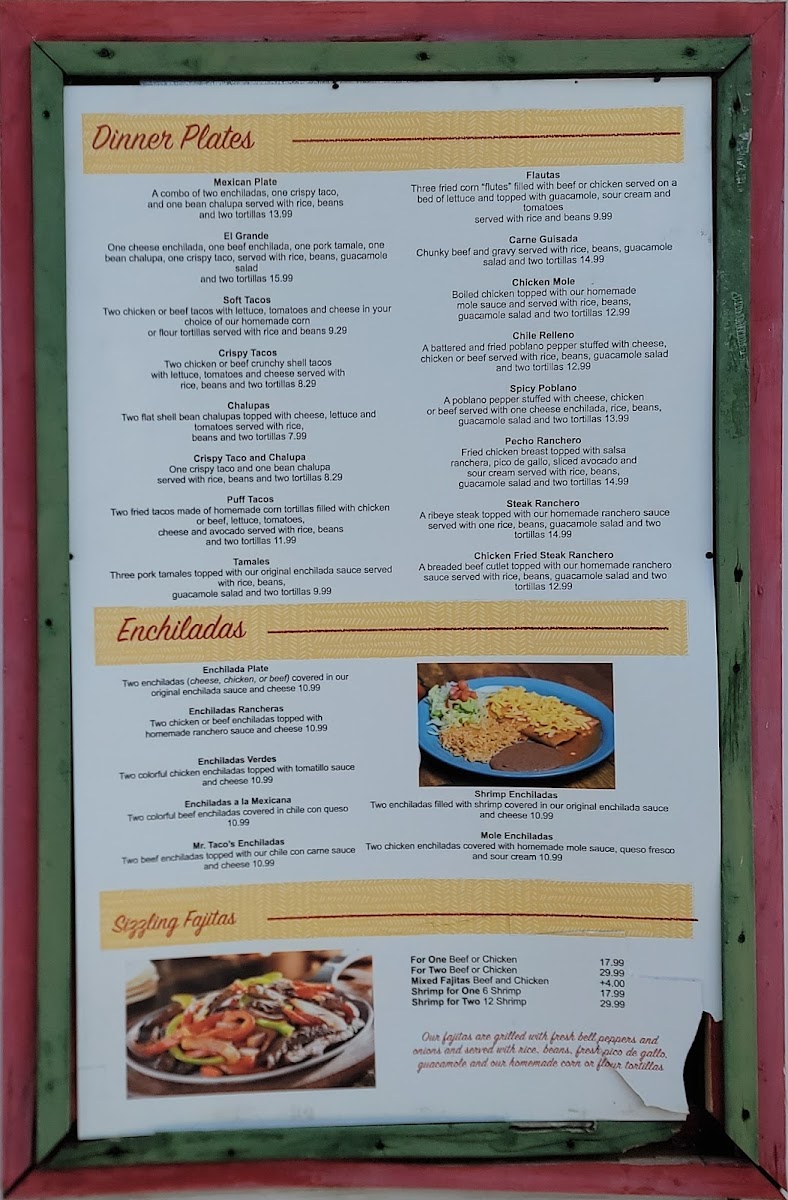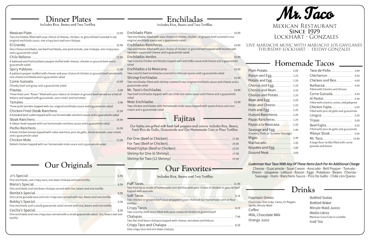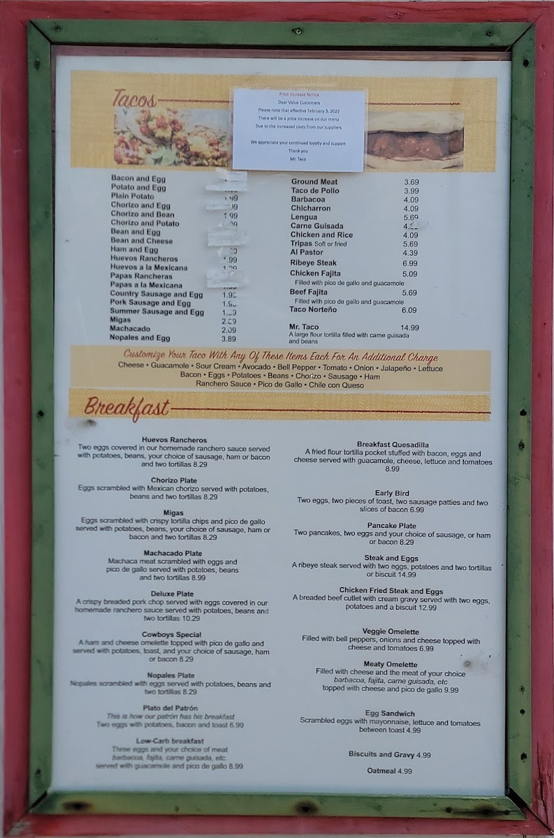 Mr Taco offers a straightforward, welcoming menu that blends classic Mexican flavors with familiar American and hearty breakfast dishes. This is the kind of place where you can enjoy casual bites and comforting meals throughout the day, whether you're starting your morning with chorizo and eggs or settling in for a relaxed lunch with tacos and enchiladas.